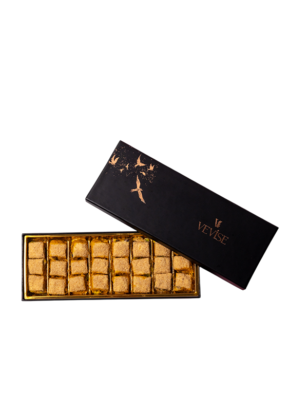 Vevise Petibör Bisküvili Karamelli Lokum, petibör bisküvi parçacıkları içinde sultan lokum katmanları arasında özel karamel dolgusu ve %25 fıstıkla hazırlanır. Her lokmada nostaljik bisküvi, yumuşak lokum ve karamelin eşsiz uyumunu keşfedin!